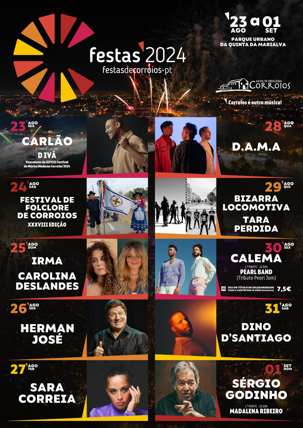 Fica o convite aos visitantes que, de 23 de agosto a 1 de setembro marcarão presença as Festas Populares de Corroios, a conhecerem o cartaz da edição 2024.